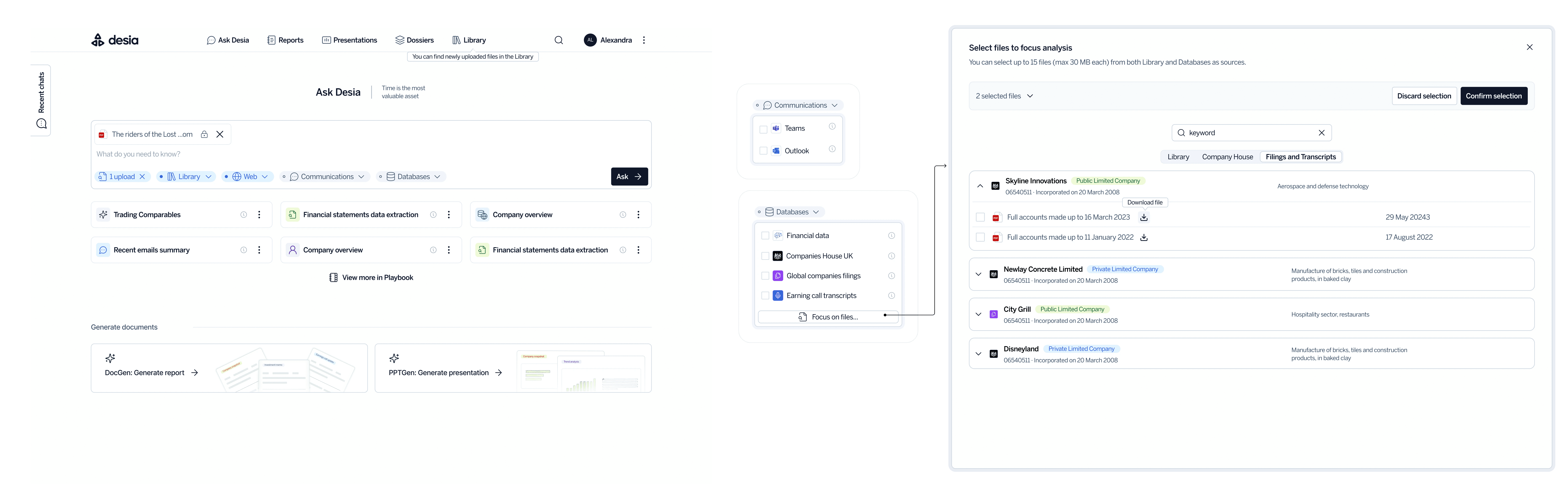 To support these workflows, I designed a flow that extended beyond web search, allowing users to upload internal files and sync their SharePoint or OneDrive folders. This gave analysts a single entry point to query their entire document ecosystem, whether looking for quantitative data (figures, dates, numbers) or qualitative context (names, events, lawsuits). Over time, we added support for additional external databases.