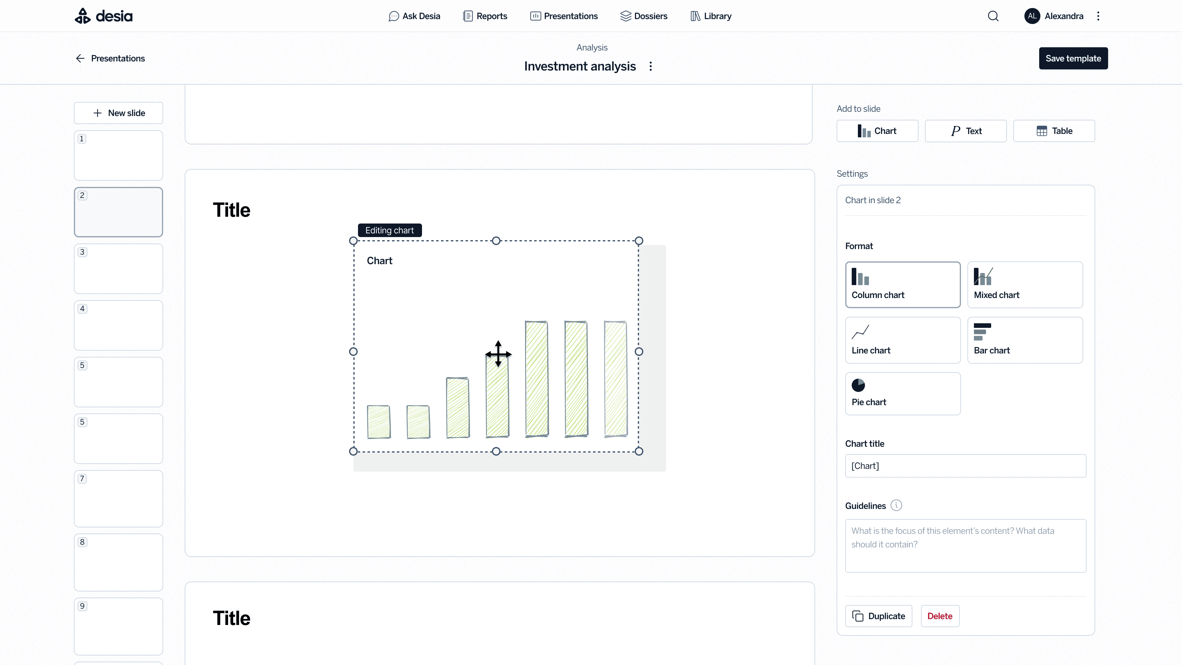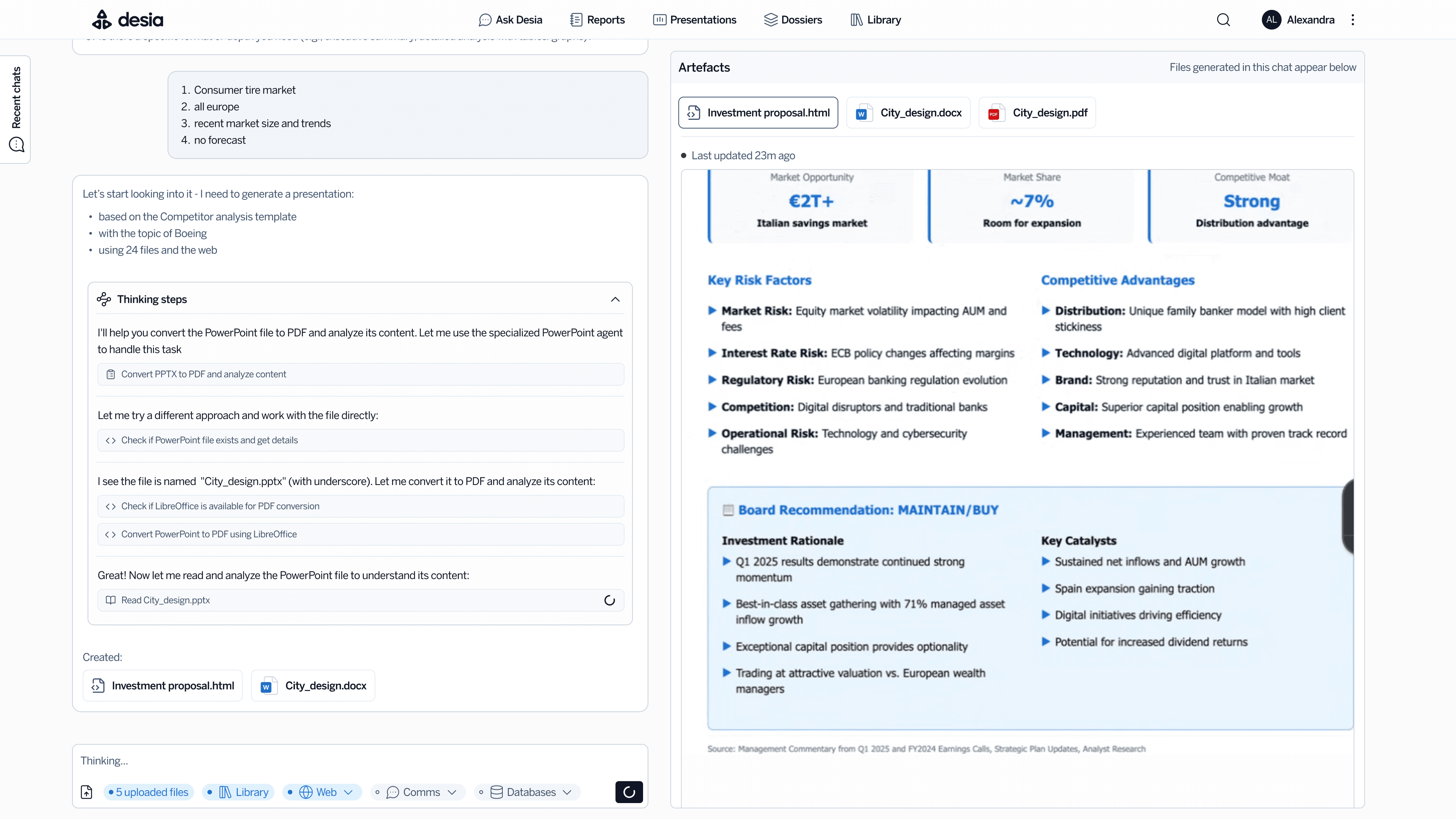 The most promising iterations were features supporting the creation of financial tables and PowerPoint presentations. Companies in finance often have strict templates, yet competitors’ AI outputs were too generic to be useful. By collaborating closely with engineers to understand how the system processes commands, I designed interfaces that explicitly ask for the necessary data, customising the AI to produce structured, accurate results. Through iterative testing internally and with industry users, these flows were refined until outputs matched professional standards.