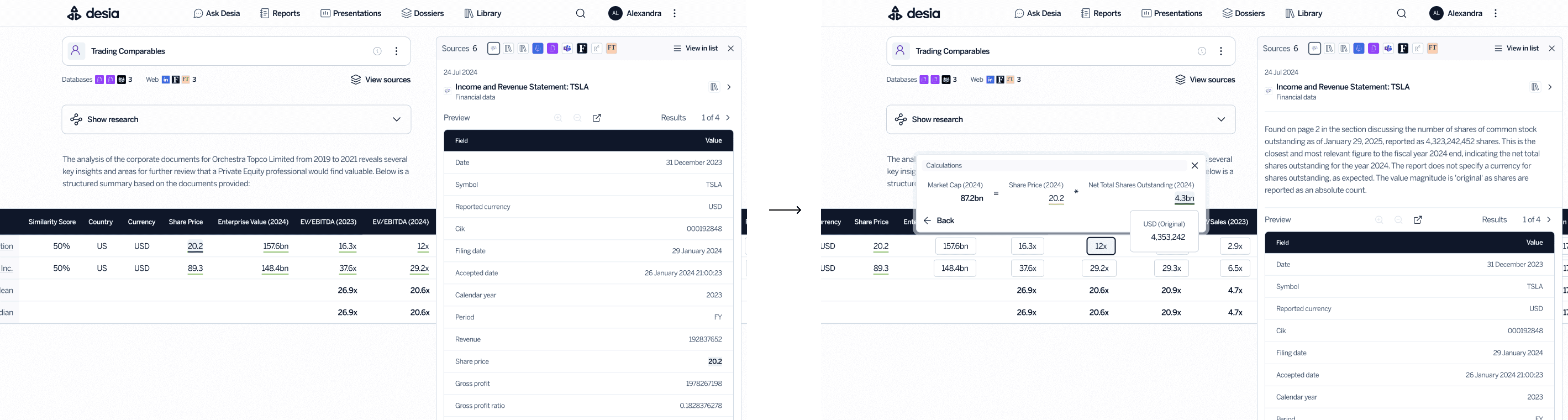 Trading Comparables is a large table of calculated coefficients used to benchmark a company’s financials against peers. Junior analysts are often asked to double-check every source manually and leave footnotes for traceability. Drawing on research into how analysts select sources, I learned that credibility and recency were the most important factors. I surfaced the most relevant details directly in the interface.