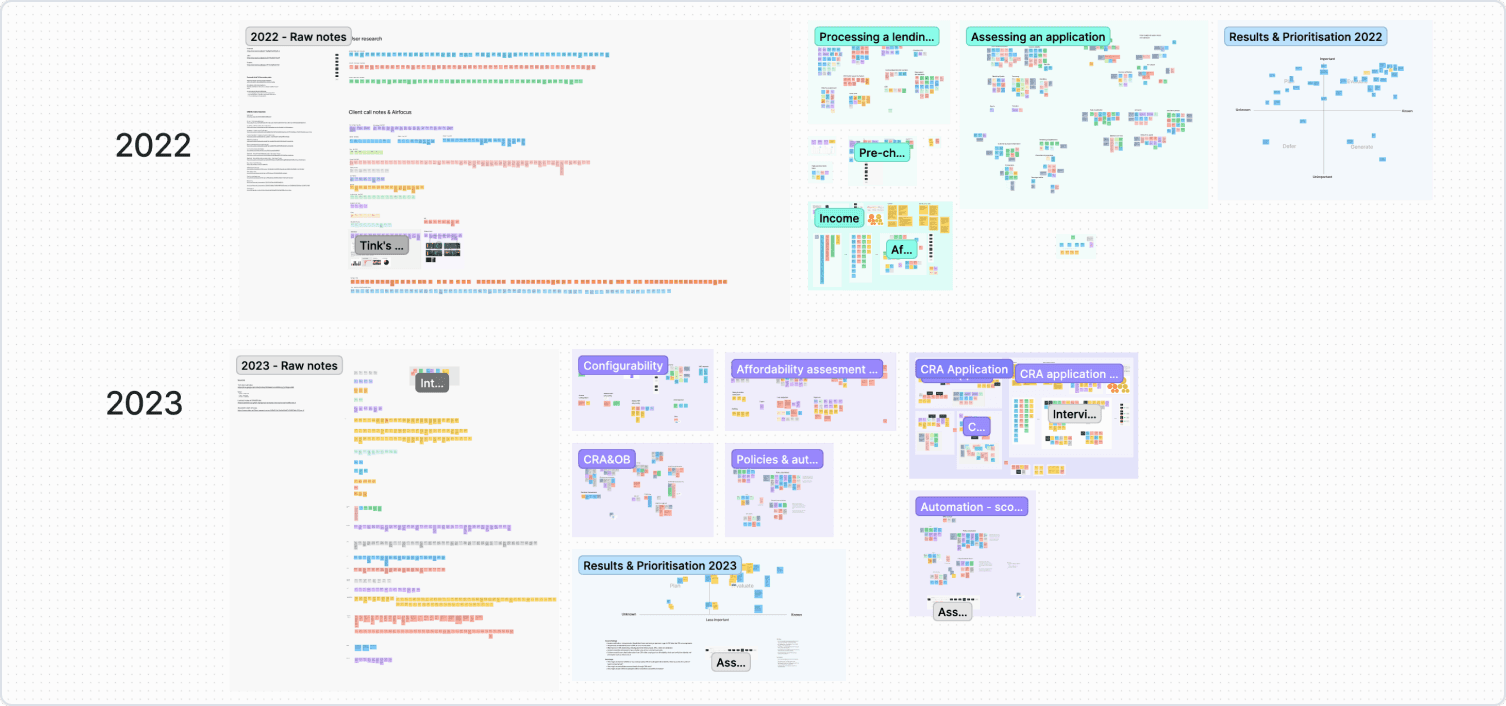 I began by collecting sales call scripts and conducting user interviews to delve into industry and user requirements with a range of lenders. Throughout my 1.5 years on the project, I've continuously curated a dynamic Research board of insights from client and external participant interviews. As we found out, our primary challenge was that the dashboard wasn’t presenting crucial information essential for a complete assessments. Losing potential clients to other competitors spurred us to investigate the specific needs the product wasn't supplying.
