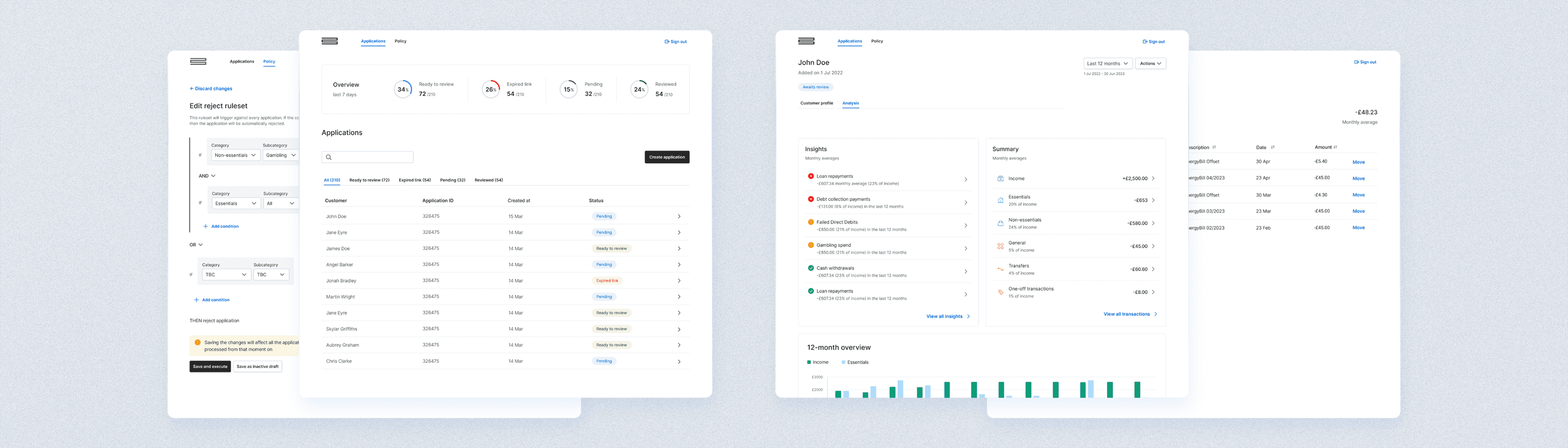 Interestingly, after most of the iterations were released, I have found that while users appreciated the improved speed of the dashboard, their ultimate preference would be for no assessment at all. This sparked an exploration into developing an automated tool that integrates company risk policies, providing instant Yes/No answers based on customer data input. After discussions with the team, I created a proof of concept for this automated product, which would be primarily managed by a Risk Manager, streamlining policy setting and monitoring. The original dashboard would remain accessible for auditing purposes, while the new tool would focus on policy management.