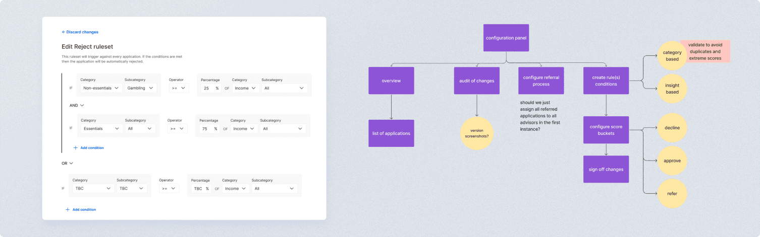 After running affinity mapping and prioritisation workshops with the Product manager and occasionally other designers (to avoid interviewer bias) in which we would categorise feedback notes into themes, we found that advisors were looking for insights into a customer's monthly earnings, expenditures, debt obligations, and potential risky financial behaviours like frequent overdrafts and gambling.