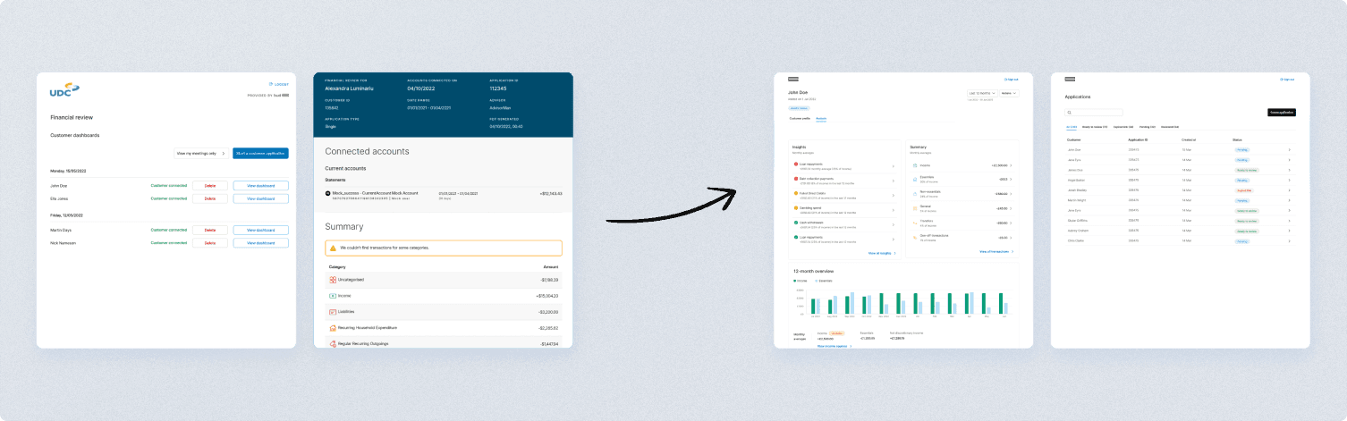 Financial advisors analyse customer spending to identify potential unhealthy patterns and areas for improvement to ultimately understand the customer's affordability. Some companies such as TSB offer debt advice, others such as TransUnion banking partners offer a range of loans. Traditionally, advisors would spend a lot of time checking each transaction, understanding what payments are made for and calculating spending coefficients to assess against their company's policy. This is extremely time consuming, and open banking means banks can now share customer transactions digitally. Machine learning categorises transactions into buckets, which can give a quick snapshot to advisors. The trick was knowing what buckets and insights to show to avoid creating biases, excluding edge case customers or simply misjudging potential profiles.