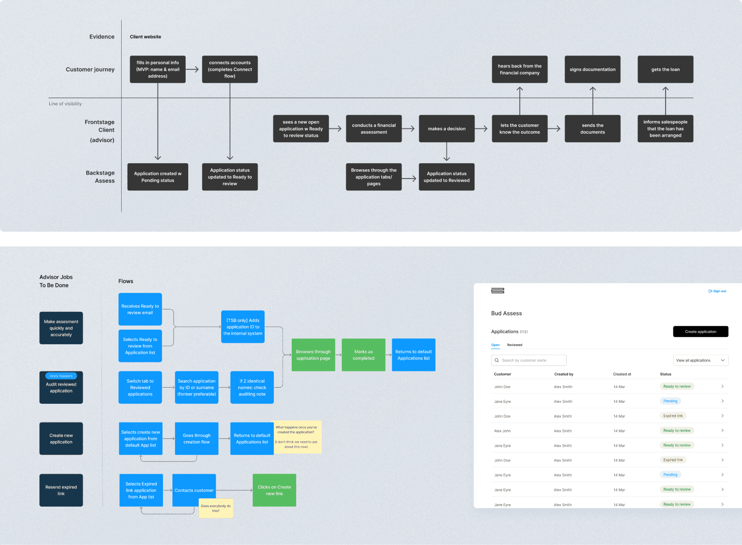Recognising the significance of these indicators, I've explored flagging them early in the process to streamline assessments and make room for further evaluation. I’ve also redesigned the applications list page so advisors would know right away which applications are ready to be picked up and redid the status pipeline in collaboration with the Back End team to ensure the status conditions are more intuitive. Overall, the product now had a redesigned information architecture in line with the mental model of advisors, according to research.